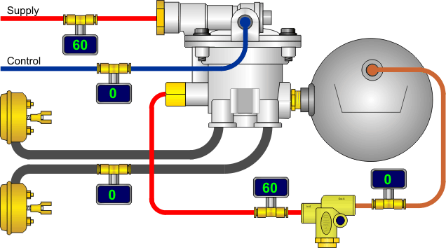 | When the driver attempts to move the vehicle the supply line is pressurized. Air flows into the supply port of the 110338 and changes the function mode from park to drive. Air continues through the body of the valve and flows out the supply outlet port to the 110257. | |