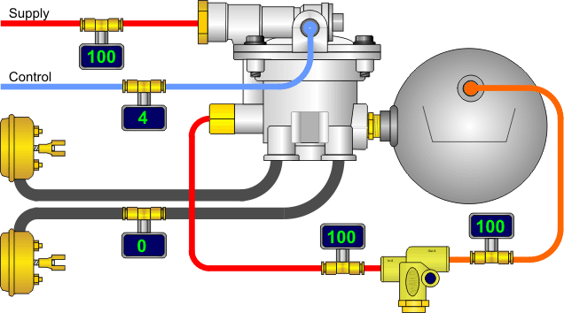 | This is typical drive mode with the supply line and reservoir pressurized. When the driver depresses the brake pedal it fills the control line with pressure which enters the 110338 through the control port. The 110338 has a crack pressure of 4.5 pounds. This means it will not deliver to the chambers until 4.5 psi is registered at the control port. | |